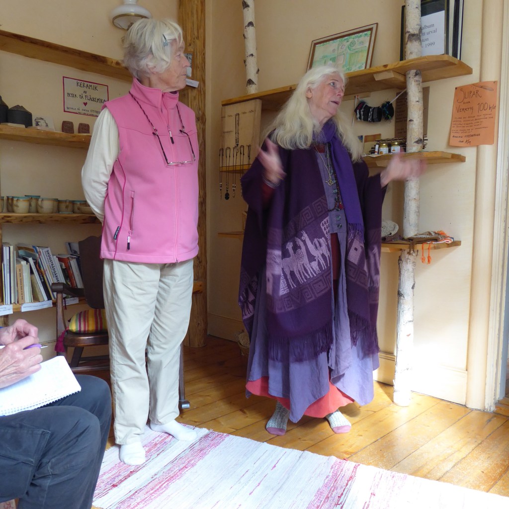 Före en rundvandring i Fridhem med alla sina rum, verksamhetsmöjligheter och dagliga användning får vi tillsammans med David Roxendal en lärorik promenad och en ingående berättelse om Fridhems yttre anläggningar med hus och trädgårdar. Förutom att vara huvudansvarig för odlingarna så bygger han också på beställning så kallade Tiny Houses. Flyttbara rustika hus på hjul på 20 km med allrum, litet kök och sovloft en trappa upp.