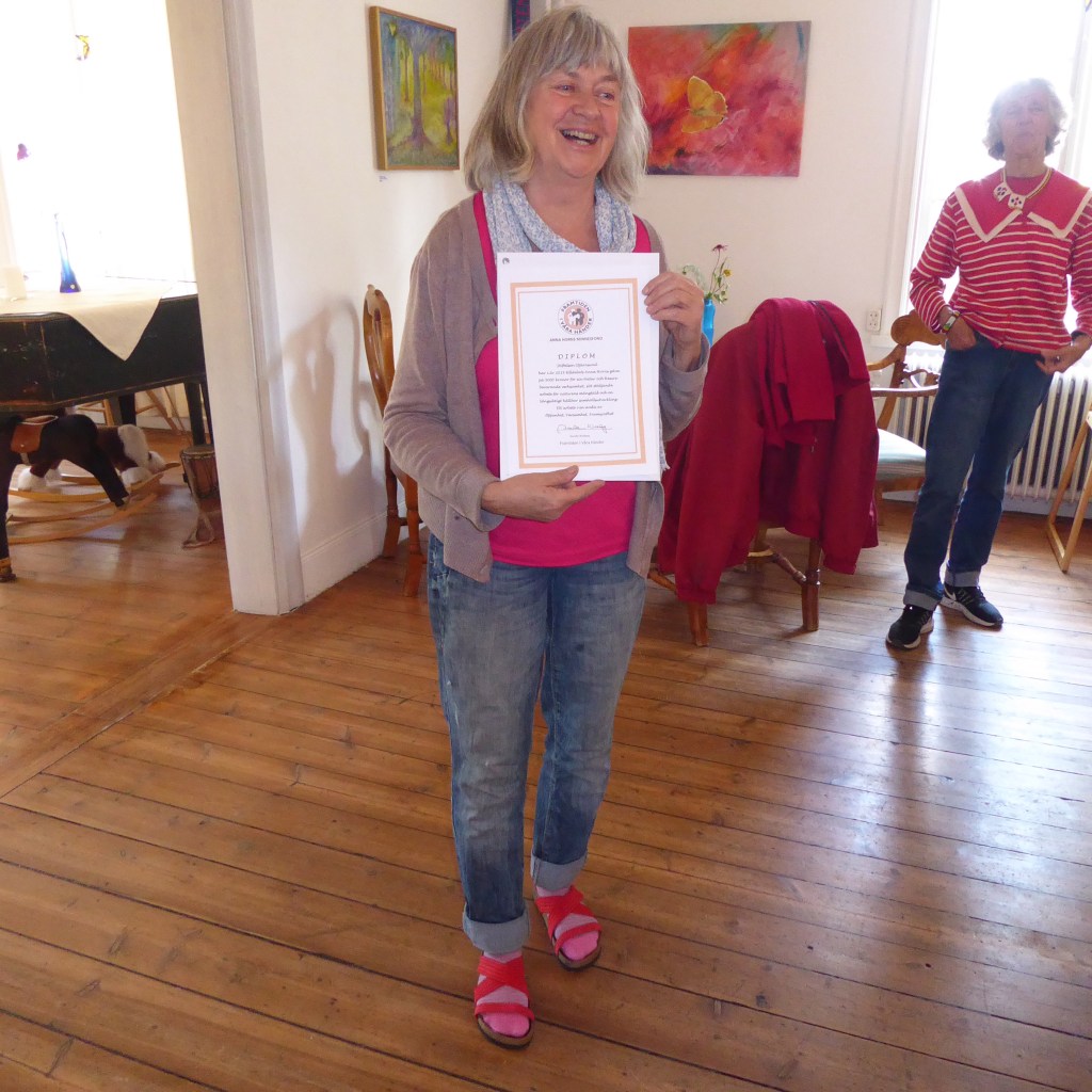 Efter återkomst till Fridhem och kaffe med hembakat i ett av de fina rummen med stilenlig möblering är det dags för utdelning av Anna Horns Minnesgåva. Det är Stiftelsens nuvarande ordförande Marianne Josefsson som tar emot diplomet och gåvan som vi förstår kommer väl till pass.